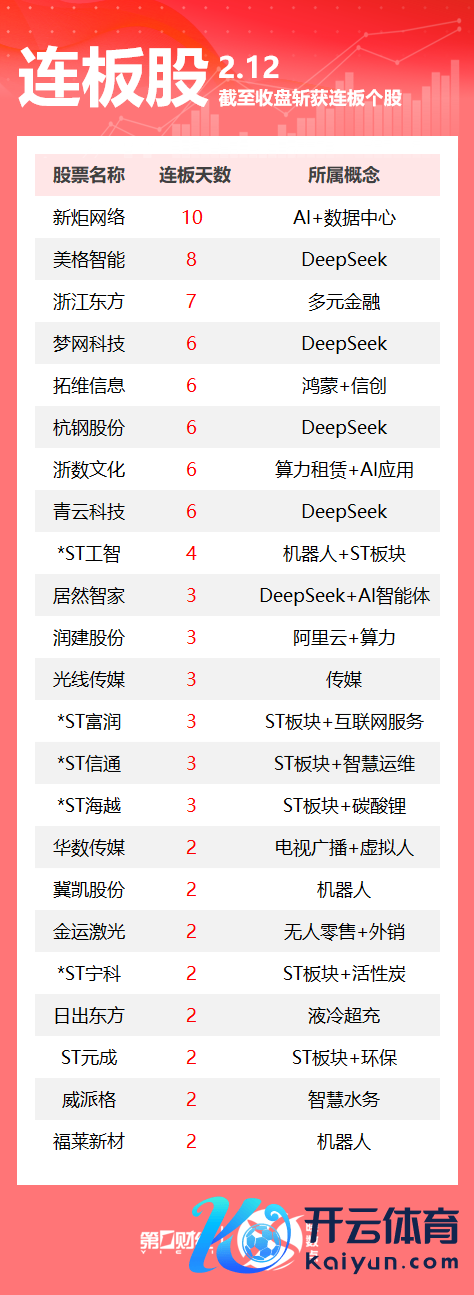 2月12日云开体育,数据闪现,A股市集计较95只个股涨停。其中云开体育数据中心倡导股新炬网罗收成10连板;DeepSeek倡导多股连板,好意思格智能8连板,梦网科技、杭钢股份6连板;多元金融倡导浙江东方7连板。一图速览本日连板股>>