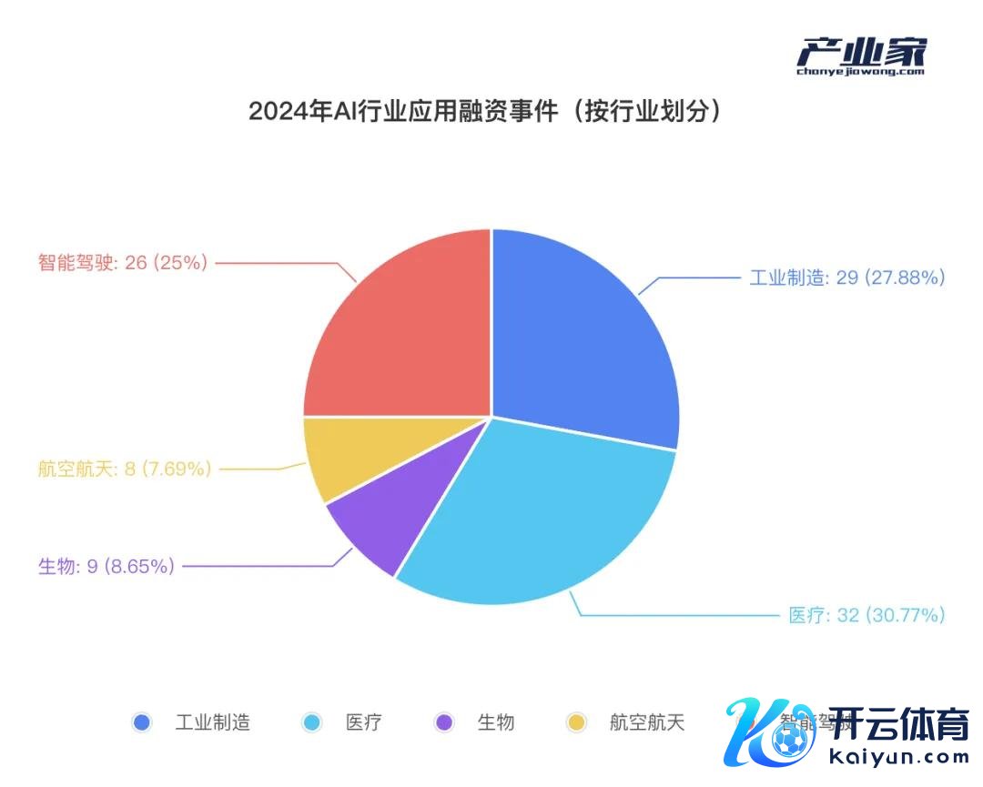 据IT桔子,2024年AI行业欺诈融资事件共209起,占比41.22%,比例与客岁简直执平。产业家统计,2024年AI行业欺诈融资事件当中,本钱主要聚会在五大行业,永诀为工业制造、医疗、智能驾驶、生物和航空航天。其中,绝大无数的机器东说念主齐被归为工业制造领域,而自动驾驶和无东说念主驾驶也齐归为智能驾驶一类。