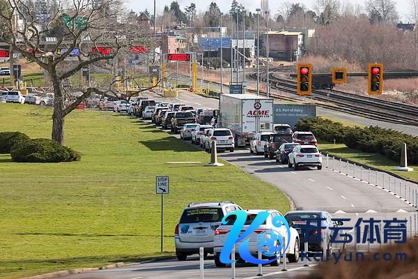 当地时辰2025年3月5日,车辆在好意思加边境列队恭候参加加拿大。 视觉中国
