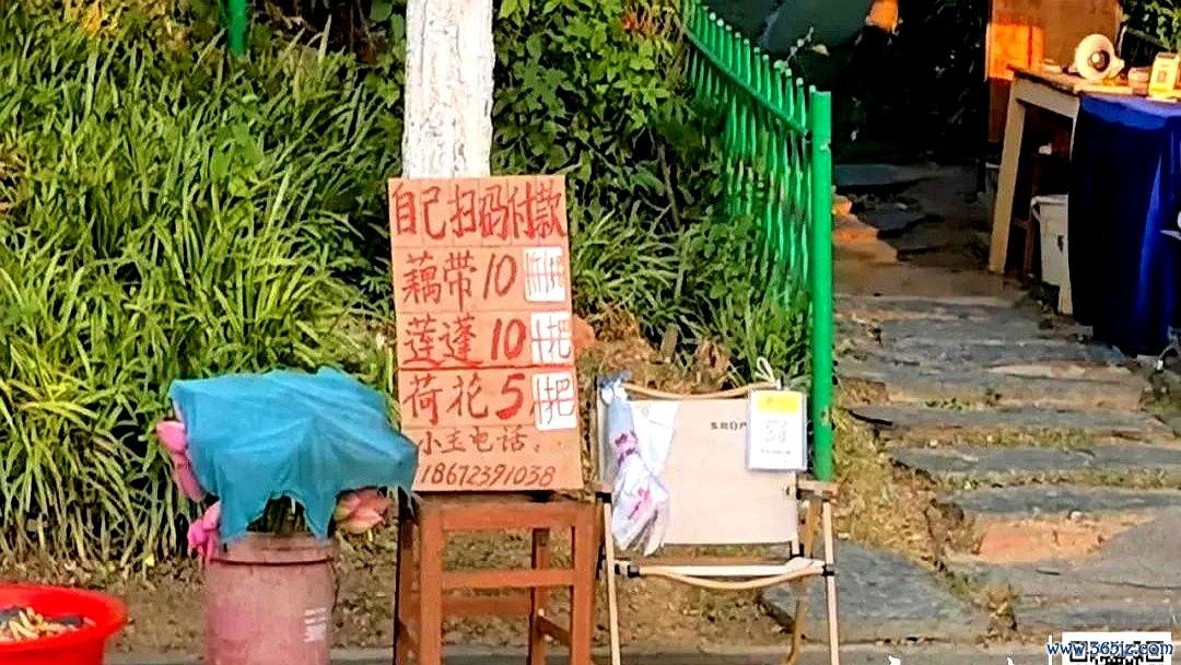 几个竹篮子装着莲蓬,一块硬纸板写着"矿泉水3块,饮料5块",傍边放着收款二维码。这可能是全中国最佛系的生意,早上摆出来,中午回家吃饭,下昼再来收摊,整整七年没东谈主保管,硬是没丢过一件货,没少过一分钱。