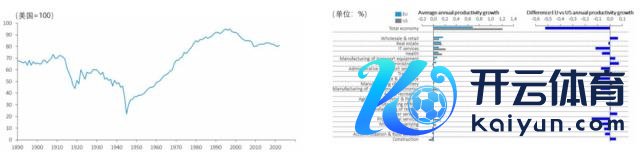 1890-2022 年欧盟对好意思国的干事分娩率(左)和 2000-2019 年好意思国和欧盟特定行业平均年干事分娩率增速(右)。图表开头:The future of European competitiveness