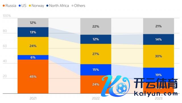 欧盟自然气入口开头的国别结构,俄乌冲破后多量份额被好意思国替代,而跟着欧盟许愿扩大对好意思自然气采购金额,明天动力对好意思依赖将进一步加深。数据开头:欧洲委员会