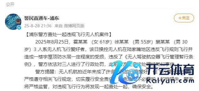 2025 年 8 月 25 日,霍某某(女,61 岁)、徐某某(男,55 岁)、裴某某(男,30 岁)3 东说念主系无东说念主机翱游醉心者,该日操控无东说念主机在陆家嘴地区违抗翱游律例翱游并形成一楼宇屋顶防水层一定进度的受损,违抗了《无东说念主驾驶航空器翱游处罚暂行条例》,警方照章对三东说念主进行了行政处罚,此前警方还屡次处理过雷共事件。